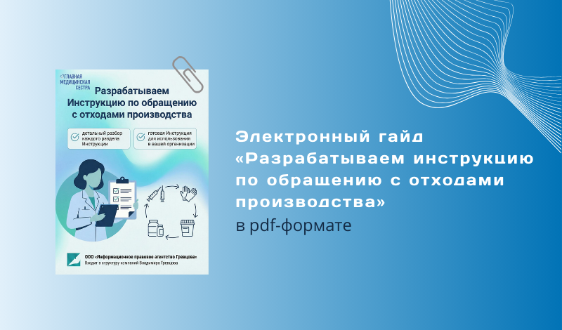 Электронный гайд «Разрабатываем инструкцию по обращению с отходами производства» — это пошаговое руководство для главной медицинской сестры и других ответственных лиц. Он поможет создать инструкцию, которая: